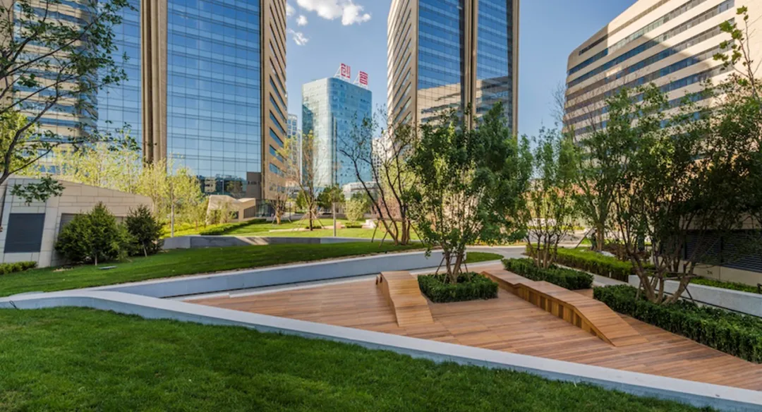 为了规避两栋建筑之间压抑、枯燥的空间感受,植入轻氧疗愈花园空间,增加感知度,视觉上消解高耸建筑形成的压迫感,在花园中享受自然环抱的一片绿洲,同时景观设置雨水管理、透水地面,减少热岛效应,构建可持续性景观,塑造赋有展示性、多元功能的城市生态环境。